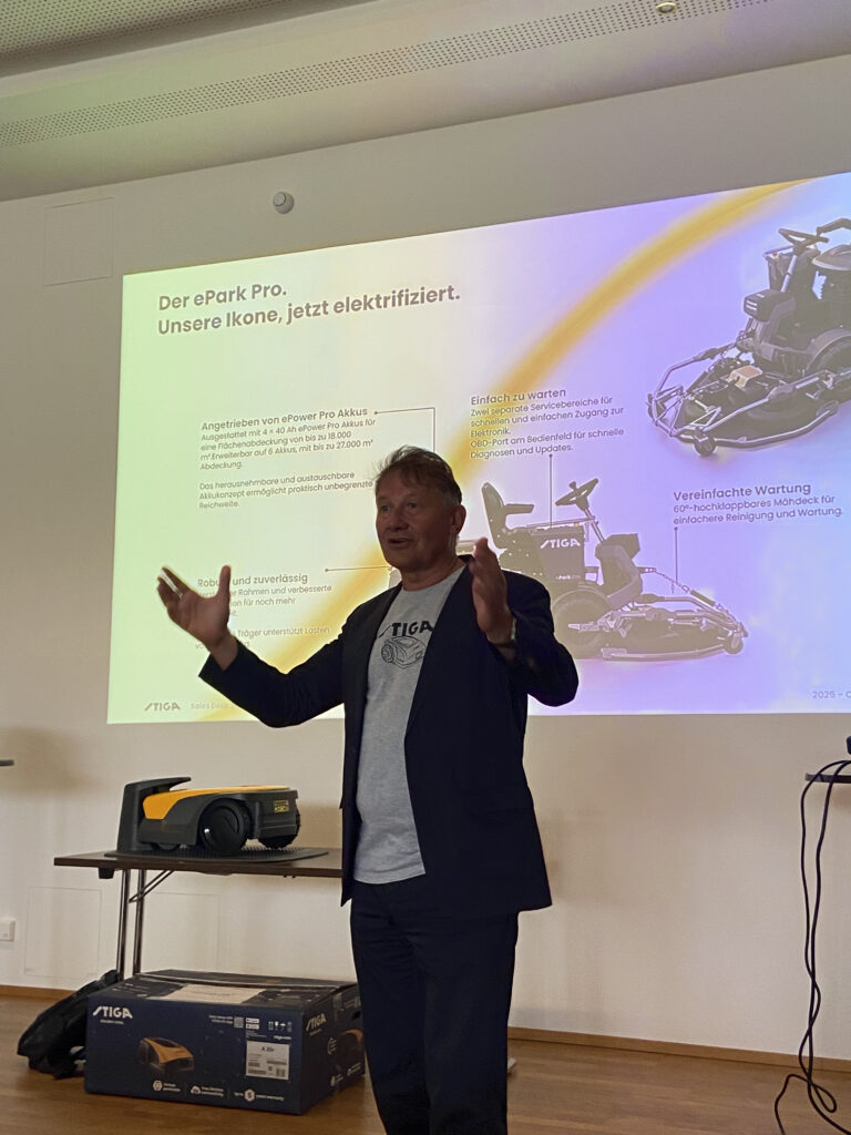 Stiga Geschäftsführer Michael Buchbauer erlärt die Funktionen des neuen ePark Pro
